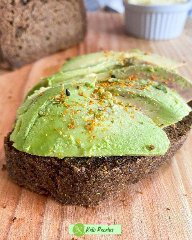 Este pan se puede tostar y servir con aguacate en rodajas y láminas de salmón ahumado para hacer una deliciosa tostada de aguacate cetogénica.